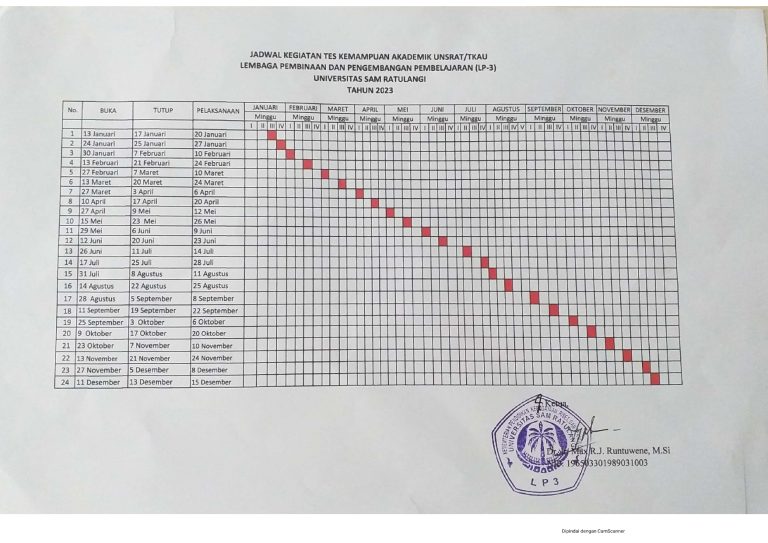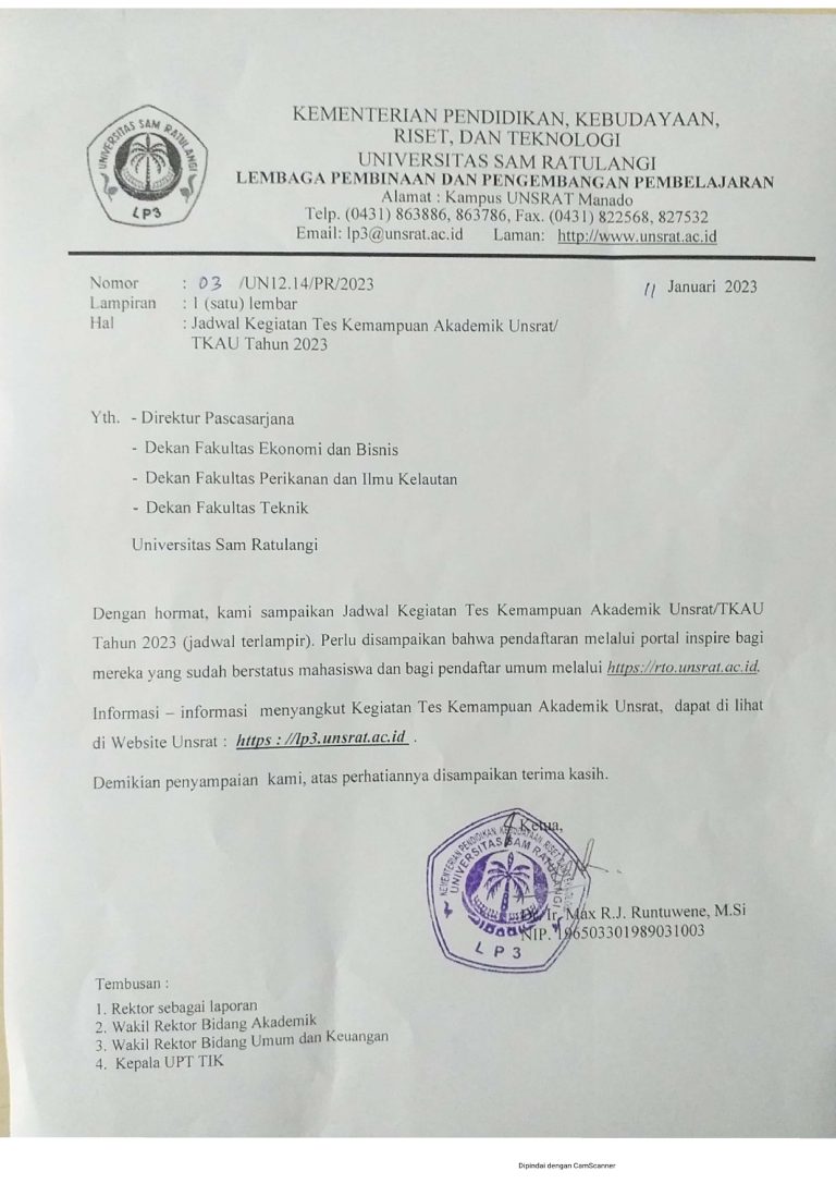 KEGIATAN TEST KEMAMPUAN AKADEMIK UNSRAT GELOMBANG IV TAHUN 2023 Dilaksanakan Pada Hari Jumat Tanggal 24 Februari Yang Di Ikuti 9 Peserta KEGIATAN TEST KEMAMPUAN AKADEMIK UNSRAT GELOMBANG V TAHUN 2023 Dilaksanakan Pada Hari Jumat Tanggal 10 Maret Tahun 2023 Yang…