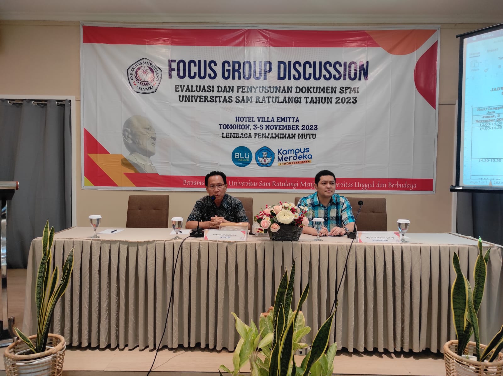 Acara ini diselenggarakan di Hotel Villa Emitta Kota Tomohon yang dihadiri oleh 52 orang peserta yang terdiri dari Pimpinan Universitas Sam Ratulangi, Ketua dan Sekretaris LPPM, Ketua dan Sekretaris LP3, Tim Penyusunan Dokumen Mutu SPMI Unsrat, Para Kepala Laboratorium Penjaminan Mutu Fakultas dan Kepala Unit Penjaminan Mutu Pascasarjana dalam lingkup Unsrat.