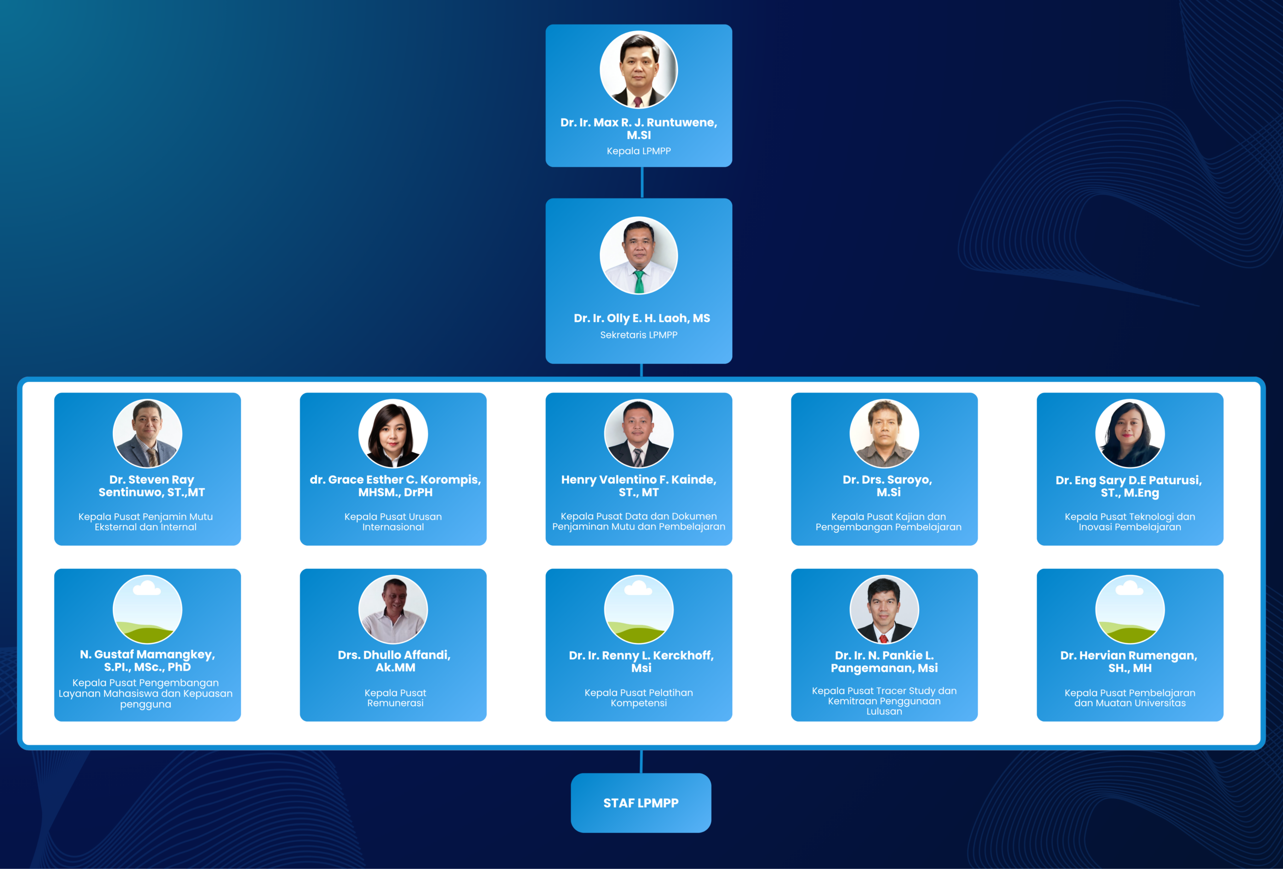 UNIVERSITAS SAM RATULANGI LEMBAGA PENJAMINAN MUTU DAN PENGEMBANGAN PEMBELAJARAN(LPMPP) STRUKTUR PIMPINAN 01 Dr. Ir. Max R.J. Runtuwene, M.Si Kepala LPMP2 02 Dr. Ir. Olly E.H. Laoh, MS Sekretaris LPMP2 03 Dr. Steven Ray Sentinuwo, ST., MTI Kepala Pusat Penjaminan Mutu Eksternal dan Internal 04 dr. Grace Esther C. Korompis, MHSM., DrPH Kepala Pusat Urusan Internasional 05 Henry Valentino Florensius Kainde, ST., MT Kepala Pusat Data dan Dokumen Penjaminan Mutu dan Pembelajaran 06 Dr. Drs. Saroyo, M.Si Kepala Pusat Kajian dan Pengembangan Pembelajaran 07 Dr. Eng Sary D.E Paturusi, ST., M.Eng Kepala Pusat Teknologi dan Inovasi Pembelajaran 08 N. Gustaf Mamangkey, S.Pi., MSc., PhD Kepala Pusat Pengembangan Layanan Mahasiswa dan Kepuasan Pengguna 09 Drs. Dhullo Affandi, Ak.MM Kepala Pusat Remunerasi 10 Dr. Ir. Renny L. Kreckhoff, Msi Kepala Pusat Pelatihan Kompetensi 11 Dr. Ir. N. Pankie L. Pangemanan, Msi Kepala Pusat Tracer Study dan Kemitraan Pengguna Lulusan 12 Dr. Hervian Rumengan, SH., MH Kepala Pusat Pembelajaran dan Muatan Universitas