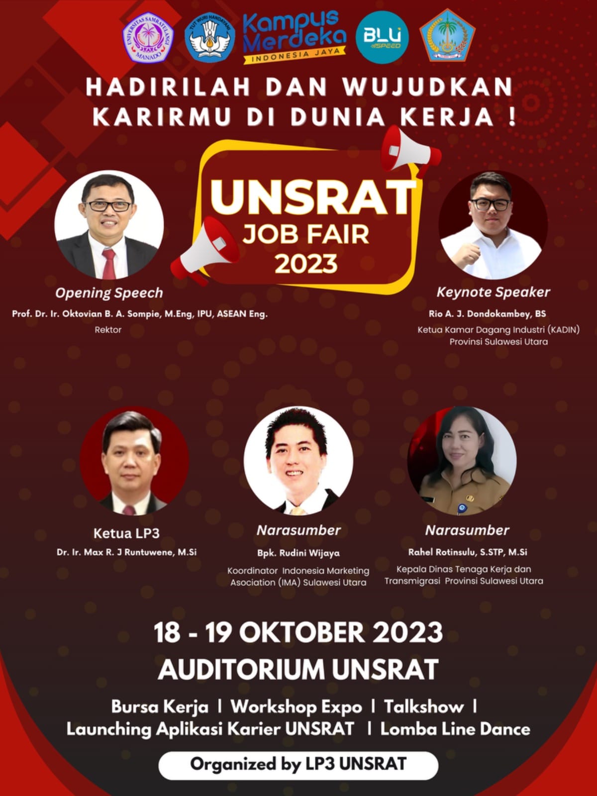 UNSRAT Job Fair 2023 ini menghadirkan Ketua Kadin SULUT Provinsi SULUT Rio Dondokambey, Kepala Dinas Tenaga Kerja & Transmigrasi Provinsi SULUT Ibu. Rahel Rotinsulu SStP, M.Si dan Koordinator IMA Bpk. Rudini Wijaya.